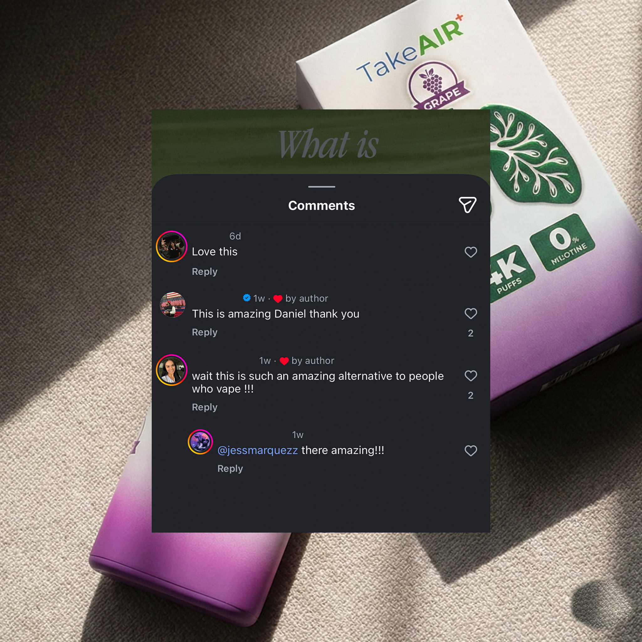 I was vaping for a couple years — mostly those disposable nicotine vapes. In hindsight, always felt sketchy about what I was inhaling. I found TakeAir+ via social media, looked into the ingredients, and decided to try the “Quit Kit.” The difference was noticeable: the inhale is smoother and lighter; exhale smells pleasant (minty or fruity depending on flavor), not chemical. The biggest win: I feel in control again